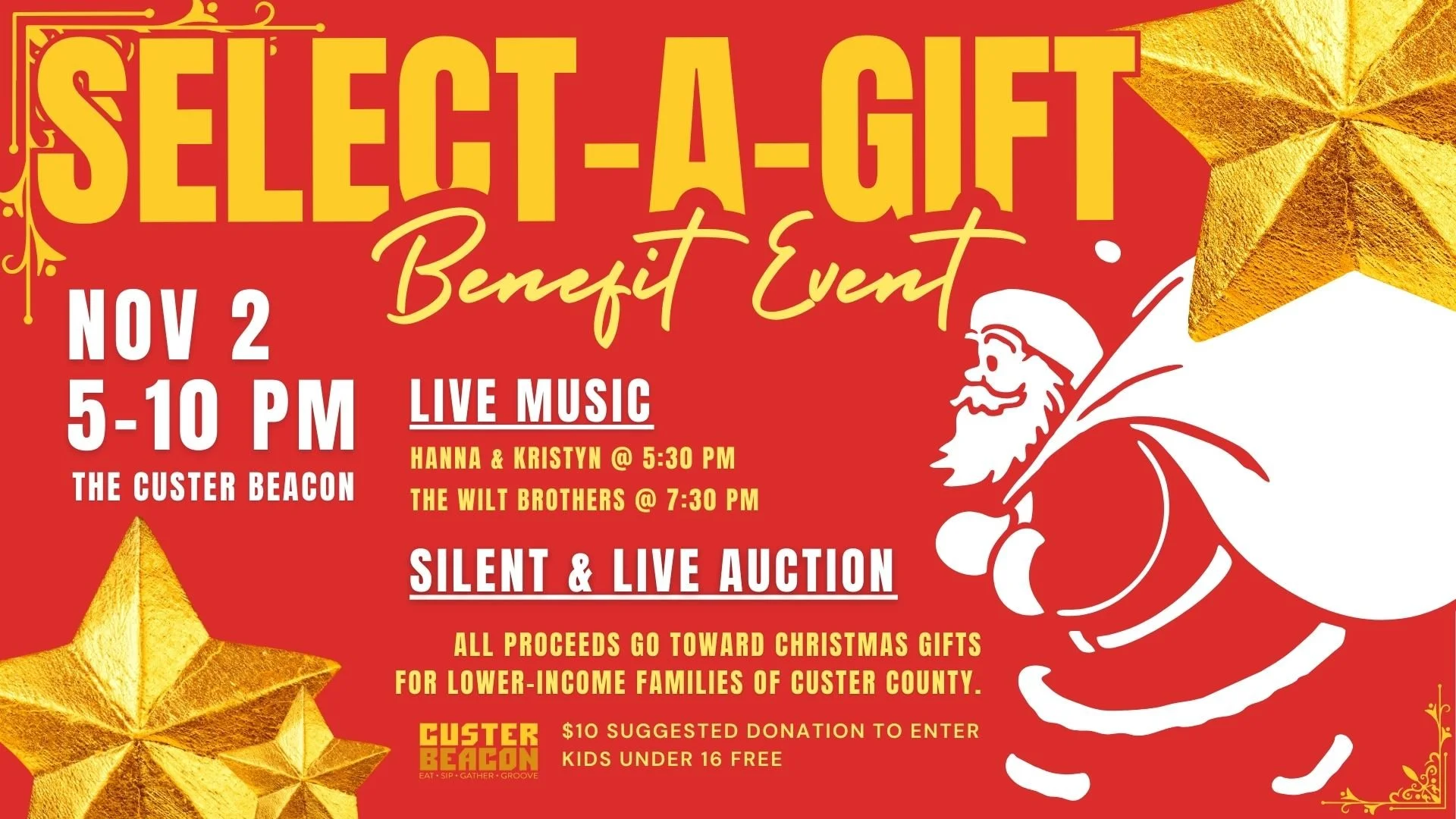Join us here November 2nd at the Custer Beacon for the annual SELECT-A-GIFT benefit event. All proceeds go towards Christmas gifts for lower-income families of Custer County.