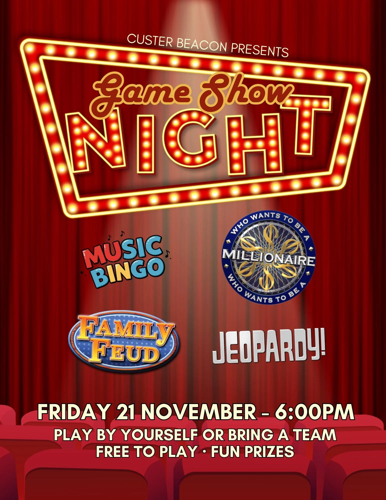 Ever wanted to compete on a gameshow?! Friday is your chance to WIN a whole host of different fun family friendly gameshow challenges! Who wants to be a Millionaire, Jeopardy, Family Feud, and MORE! if you love our Trivia nights, you’ll love Gameshow Night!